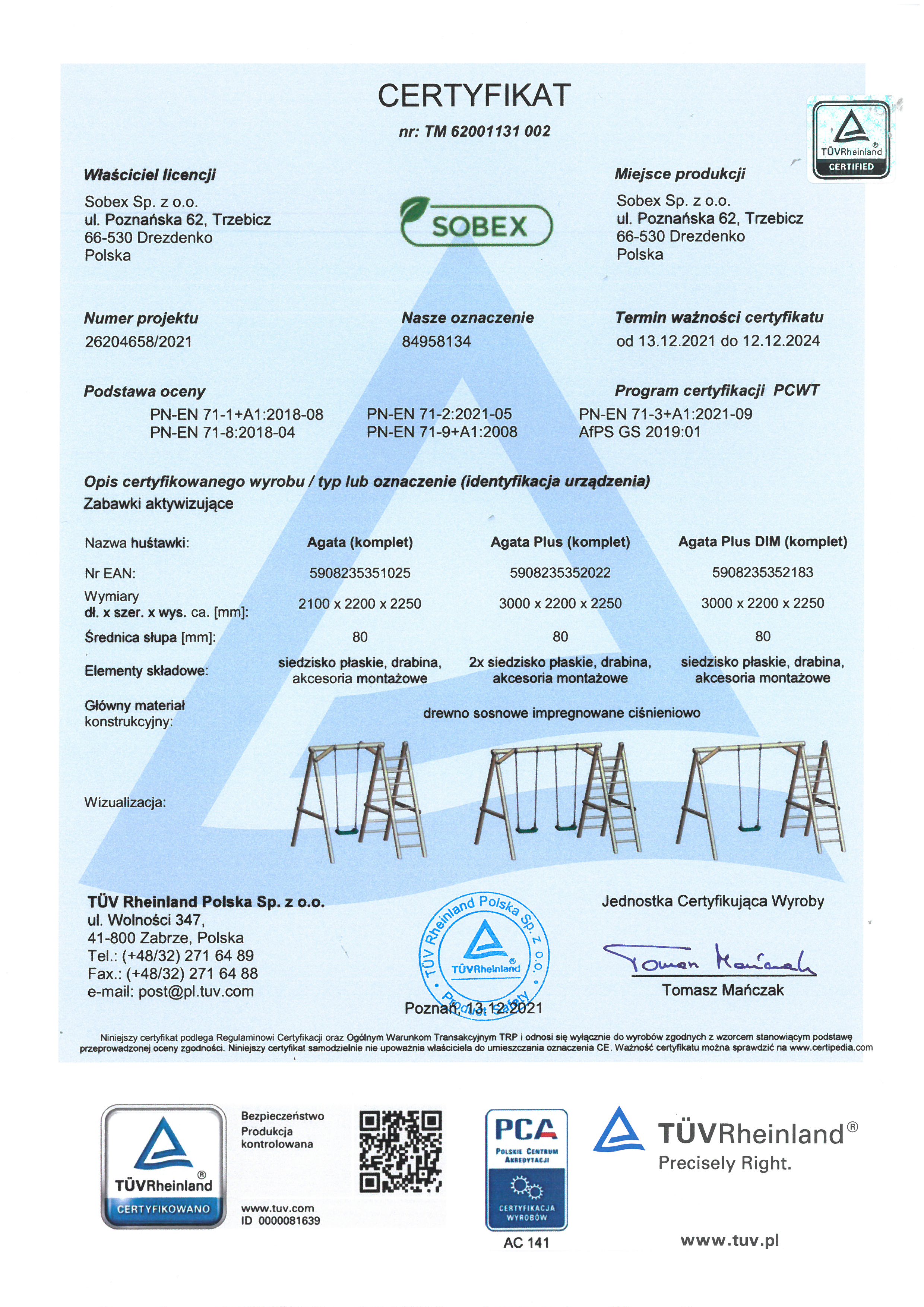 CERTYFIKAT TUV HUŚTAWKI AGATA