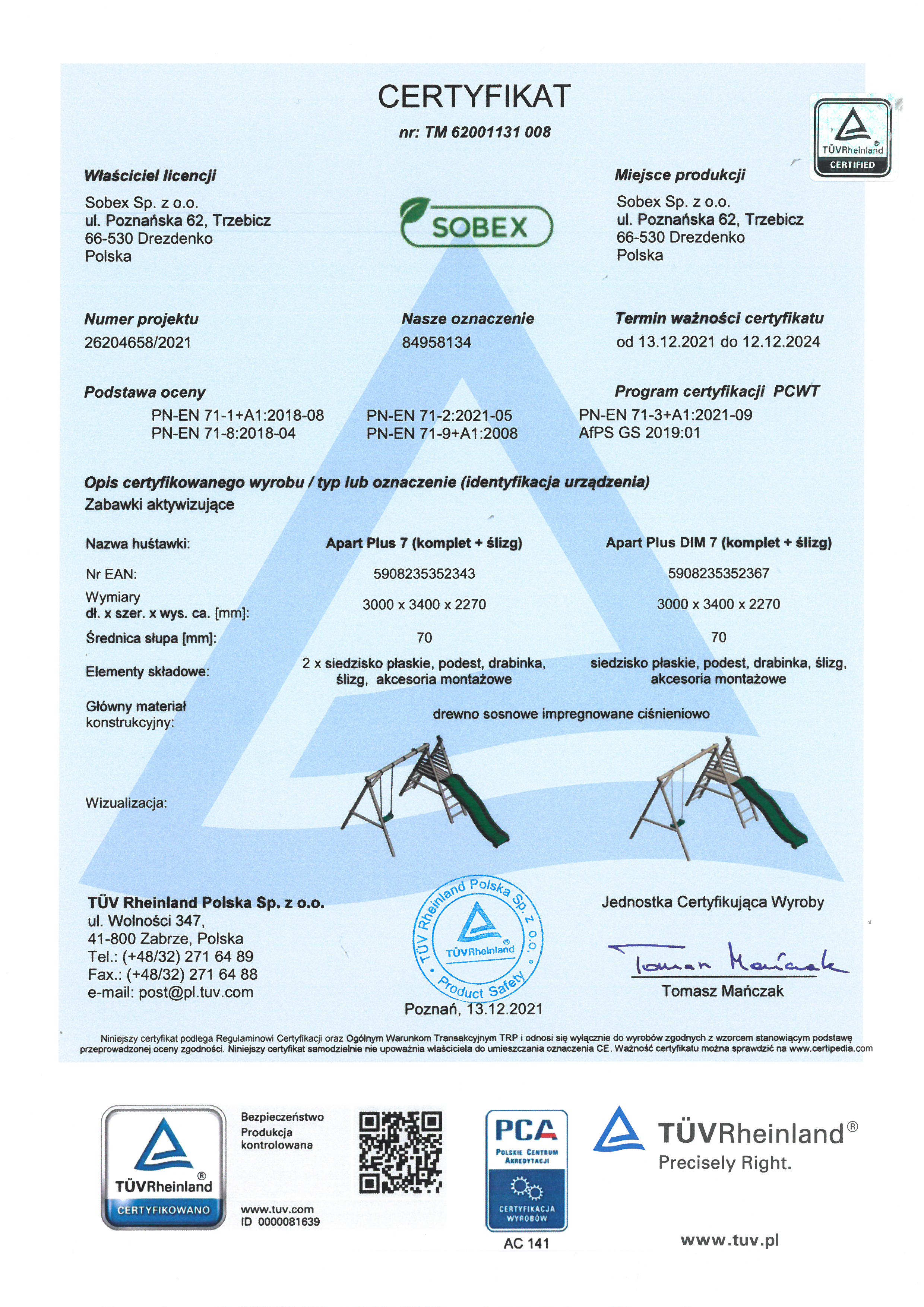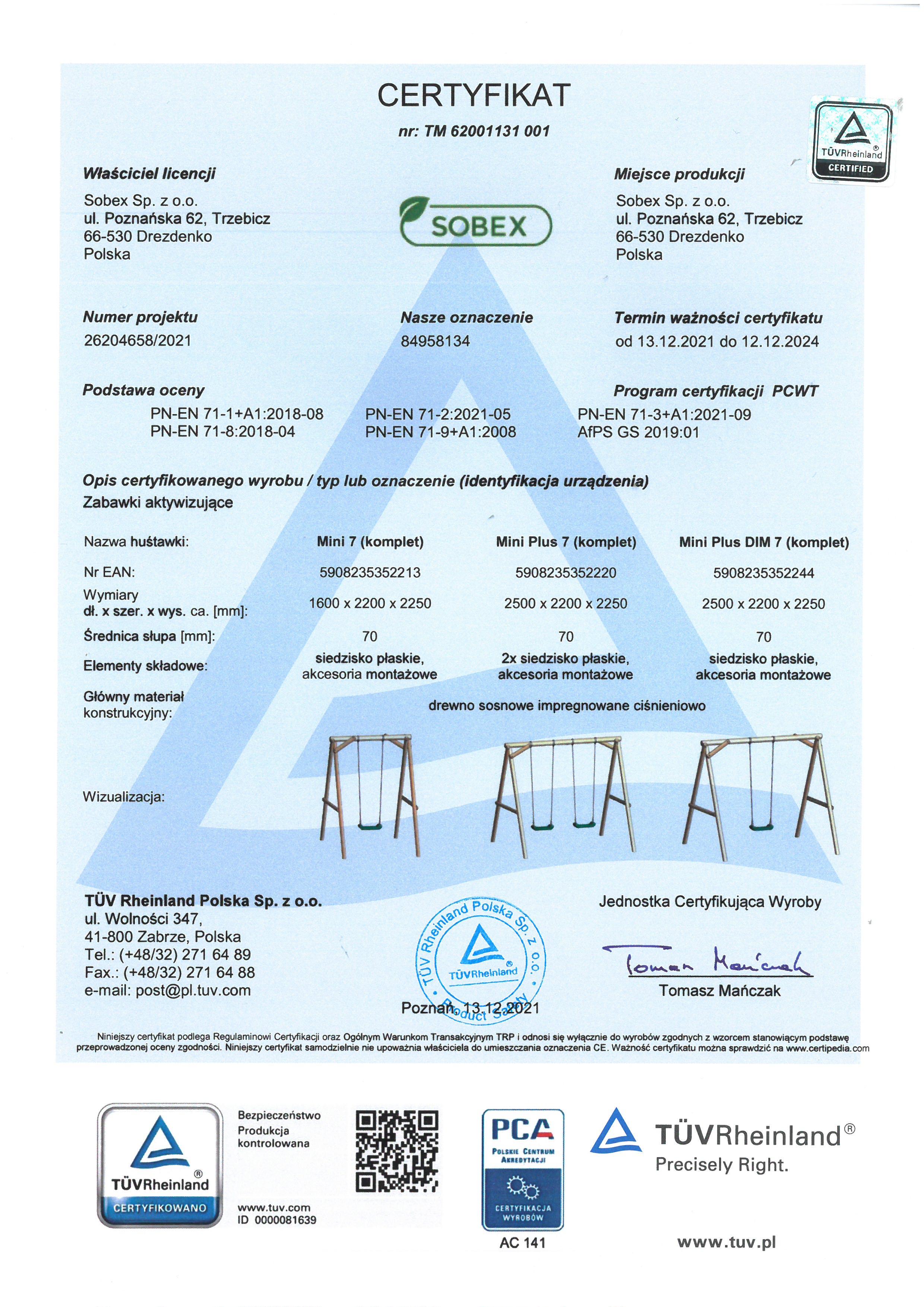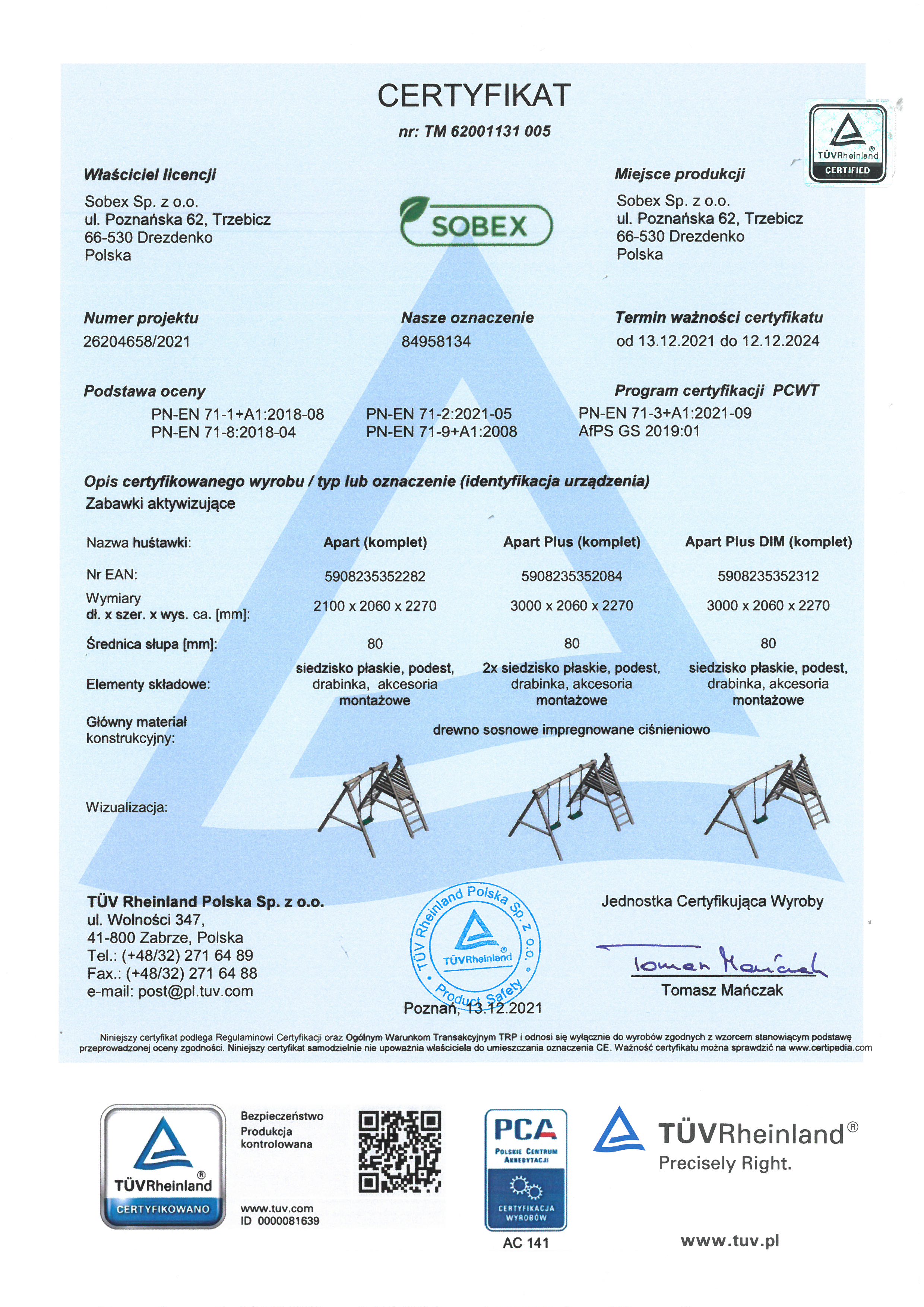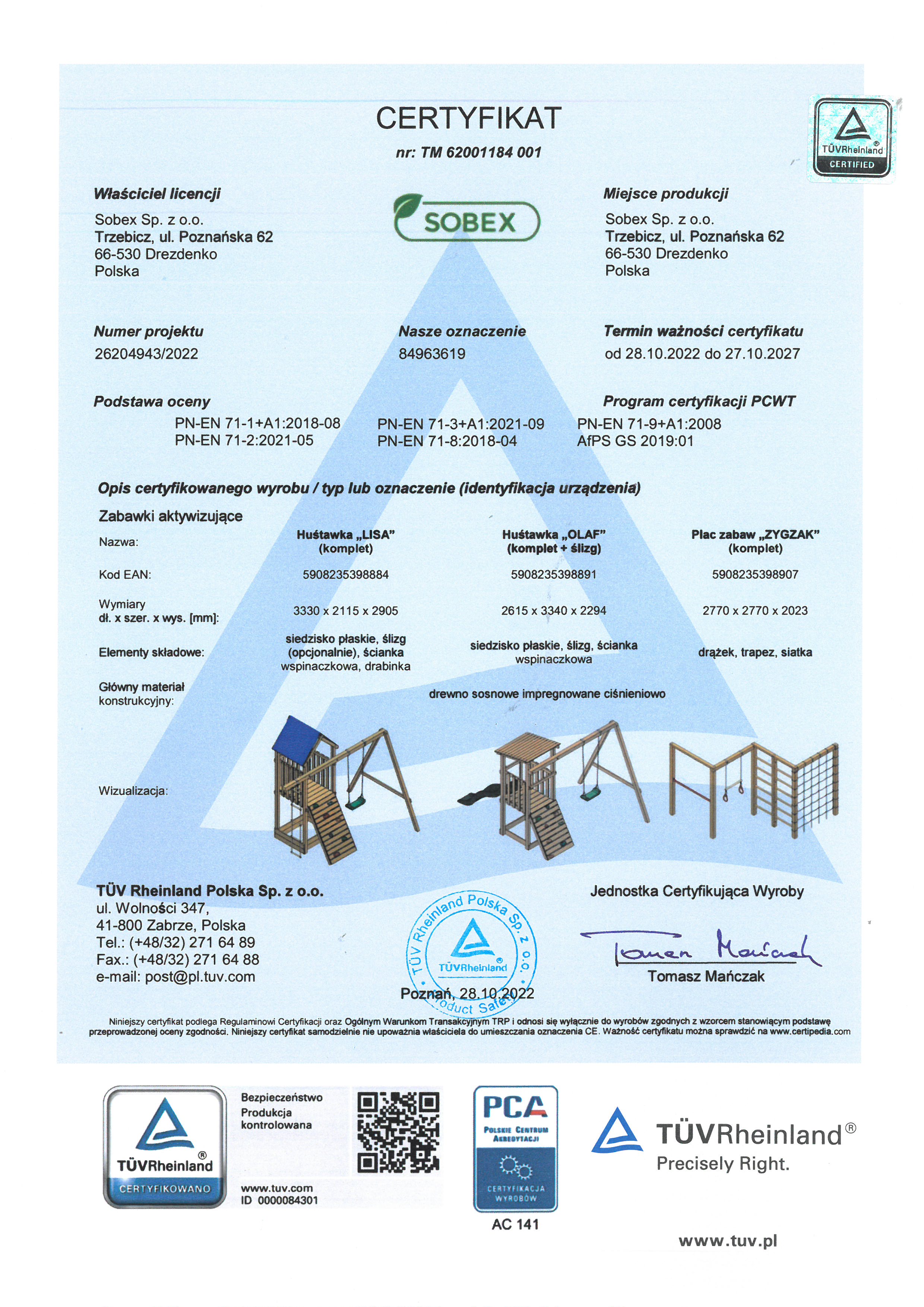 Certyfikat TUV HUŚTAWKI ADAŚ