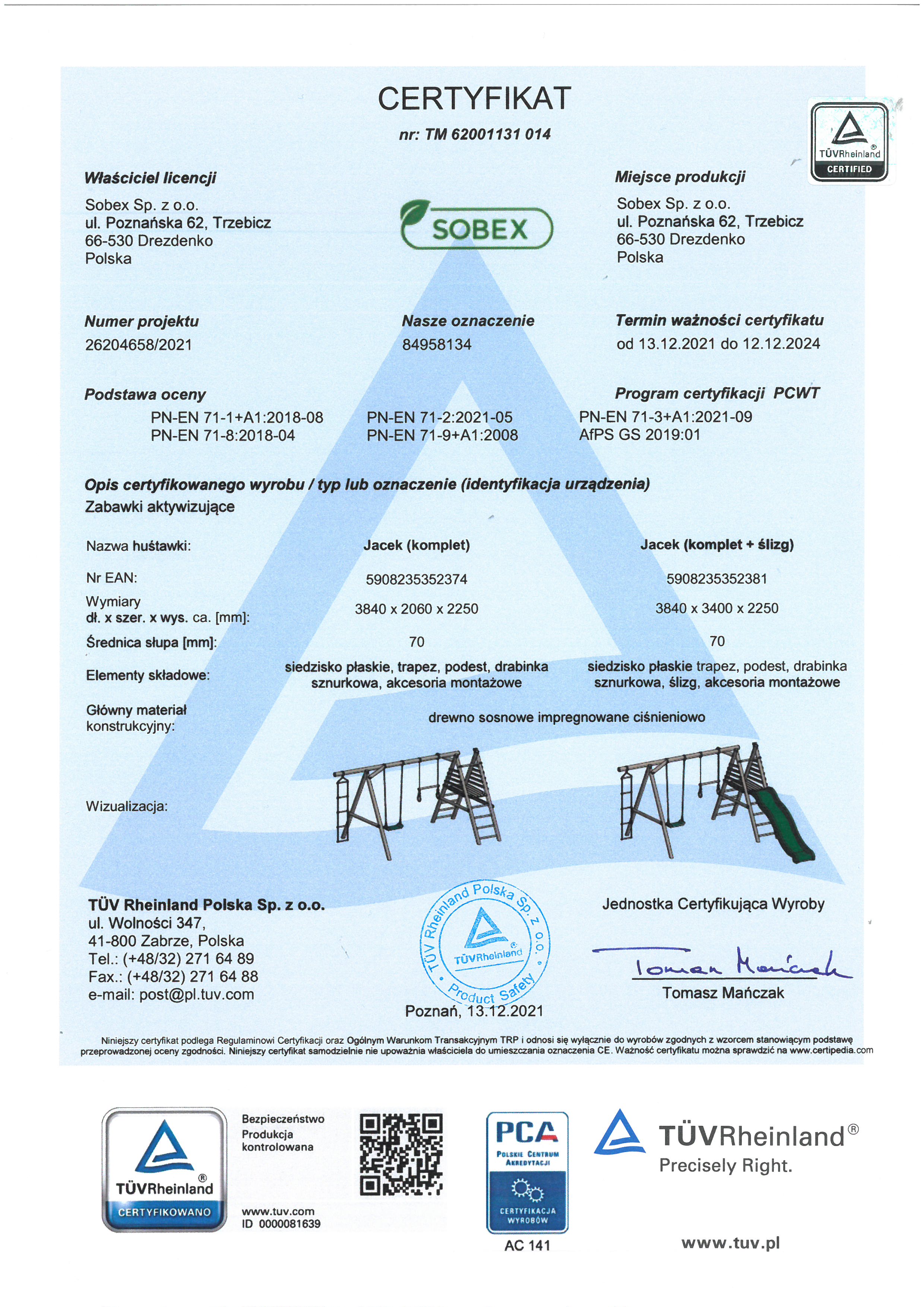 CERTYFIKAT TUV HUŚTAWKI JACEK