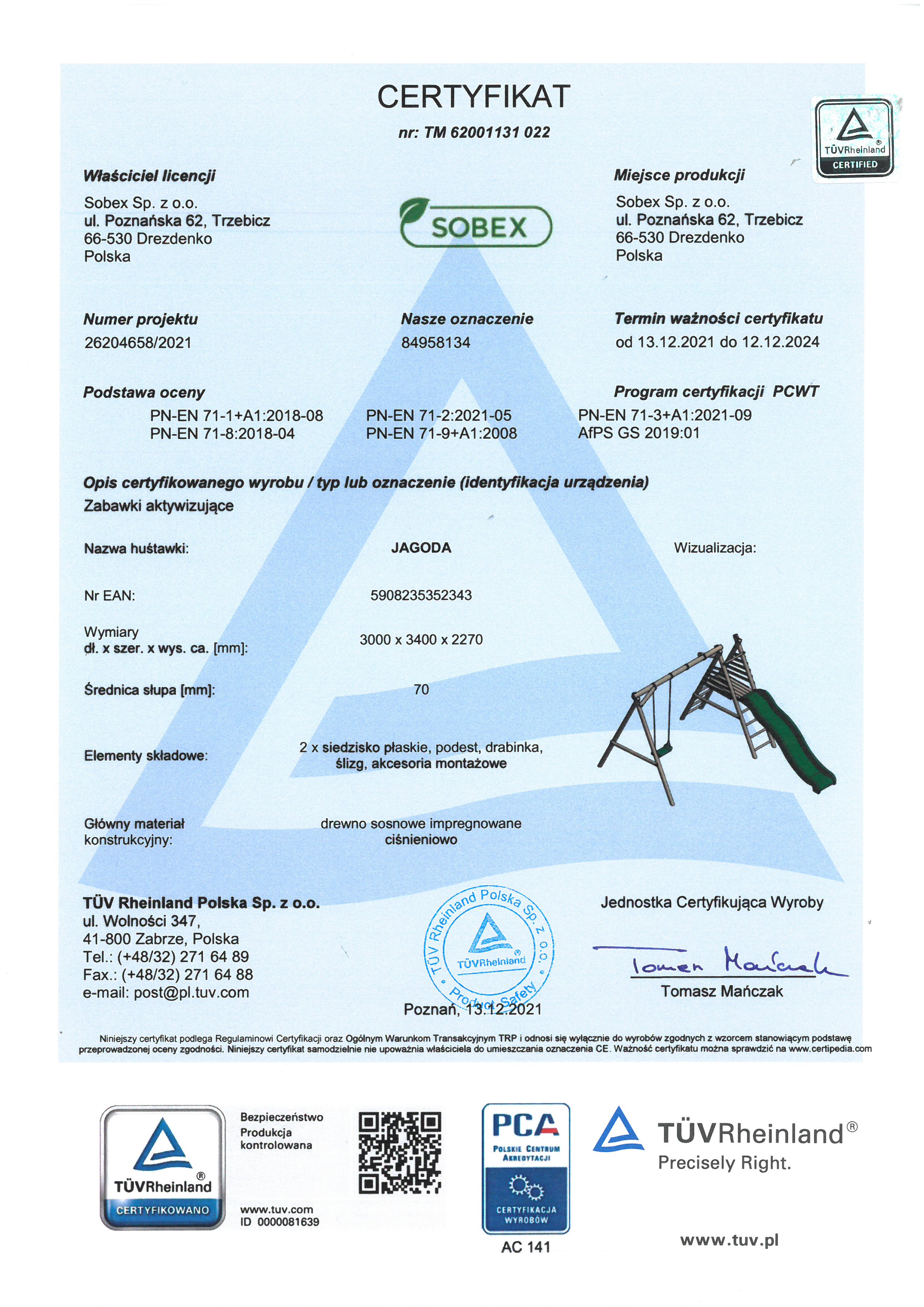CERTYFIKAT TUV HUŚTAWKA JAGODA