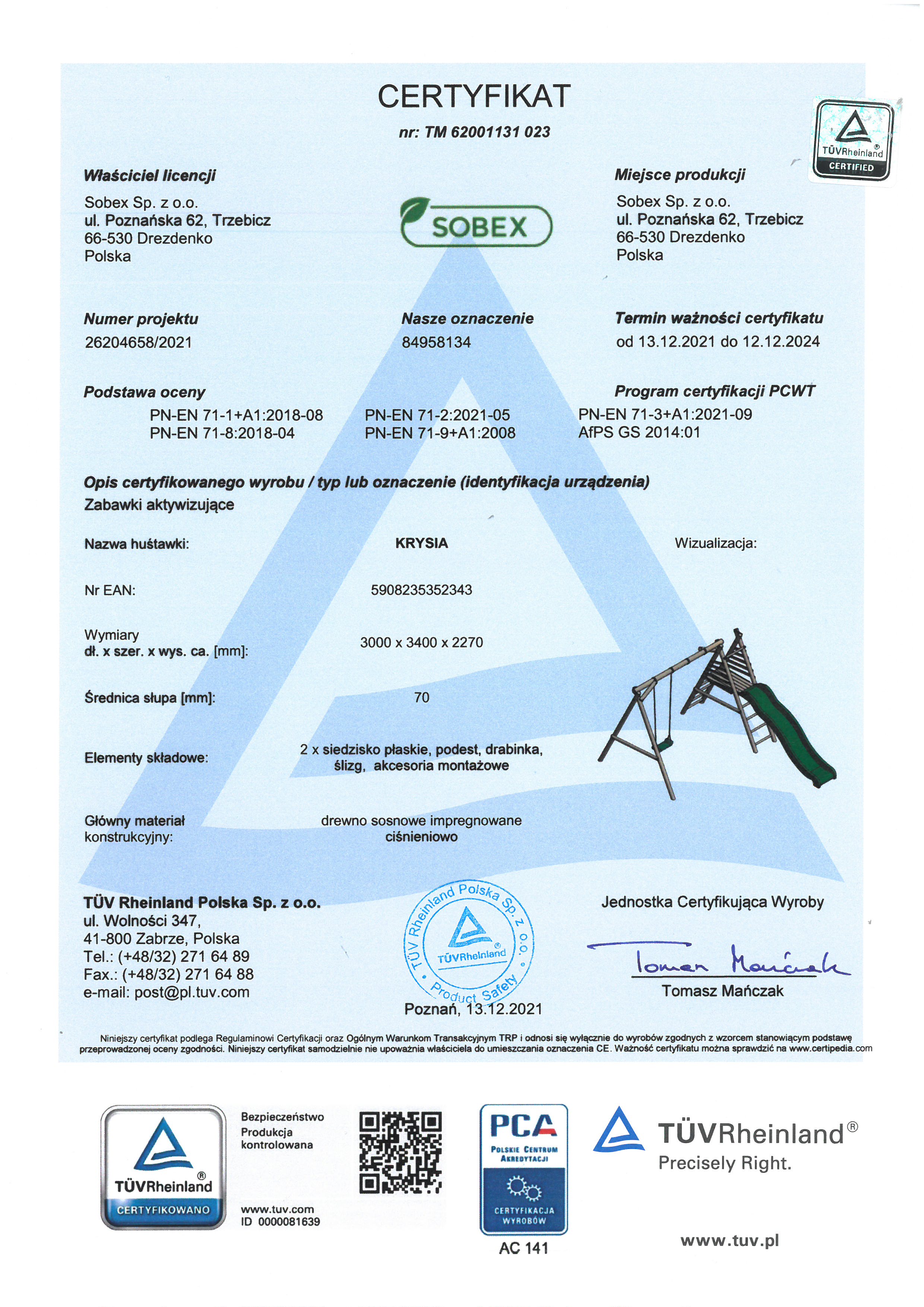 CERTYFIKAT TUV HUŚTAWKA KRYSIA