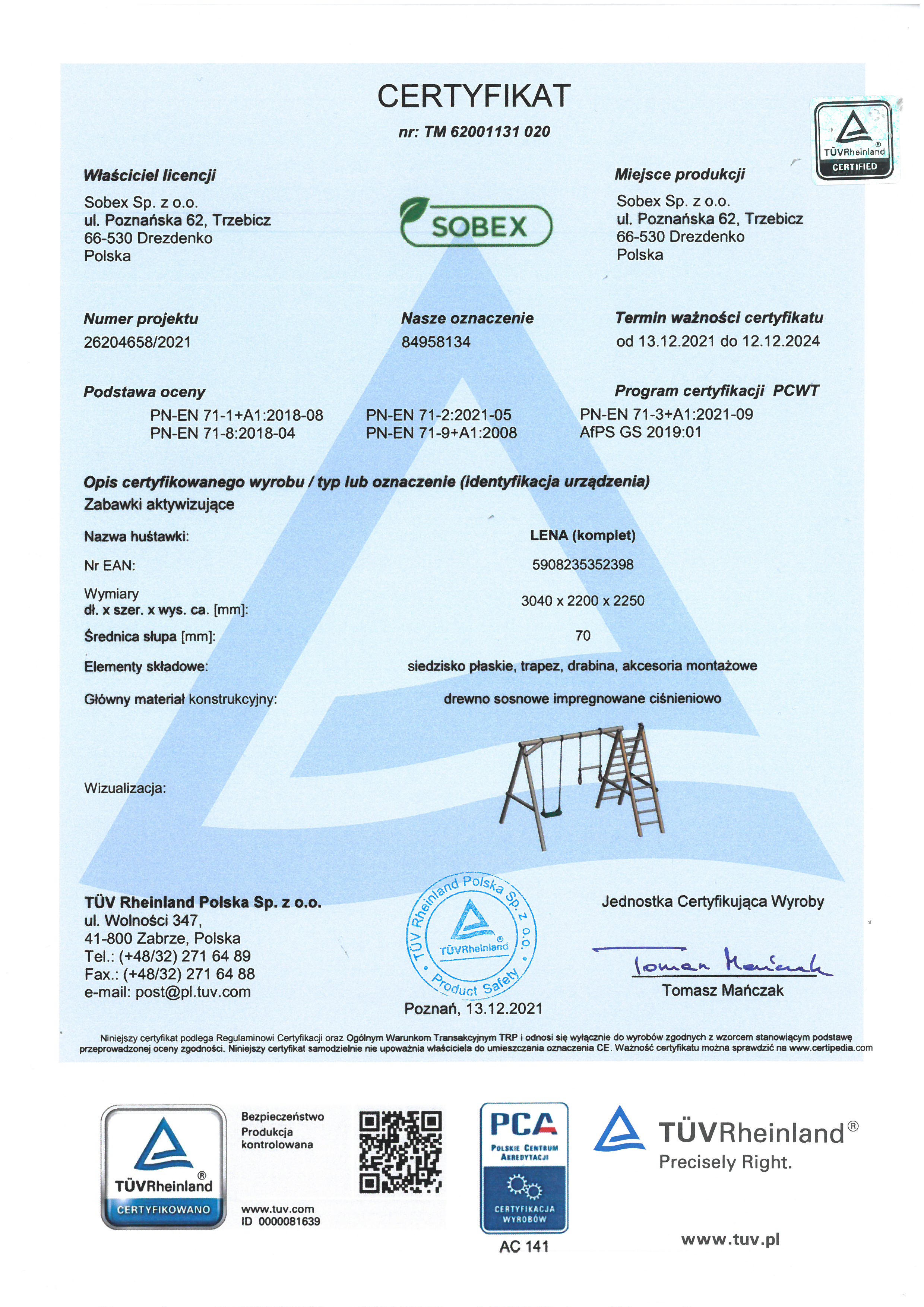 CERTYFIKAT TUV HUŚTAWKA LISA