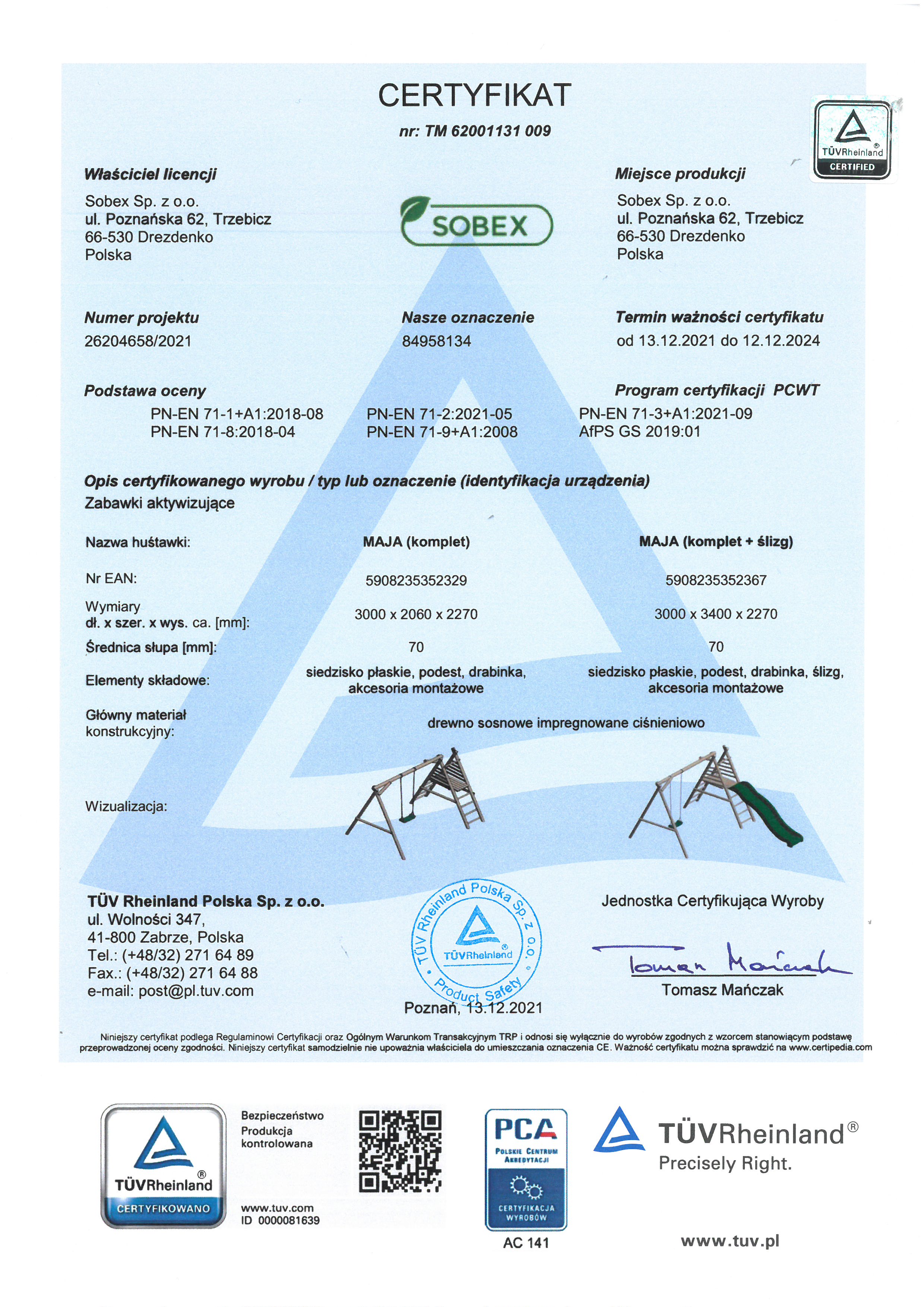 CERTYFIKATY TUV HUŚTAWKA MAJA