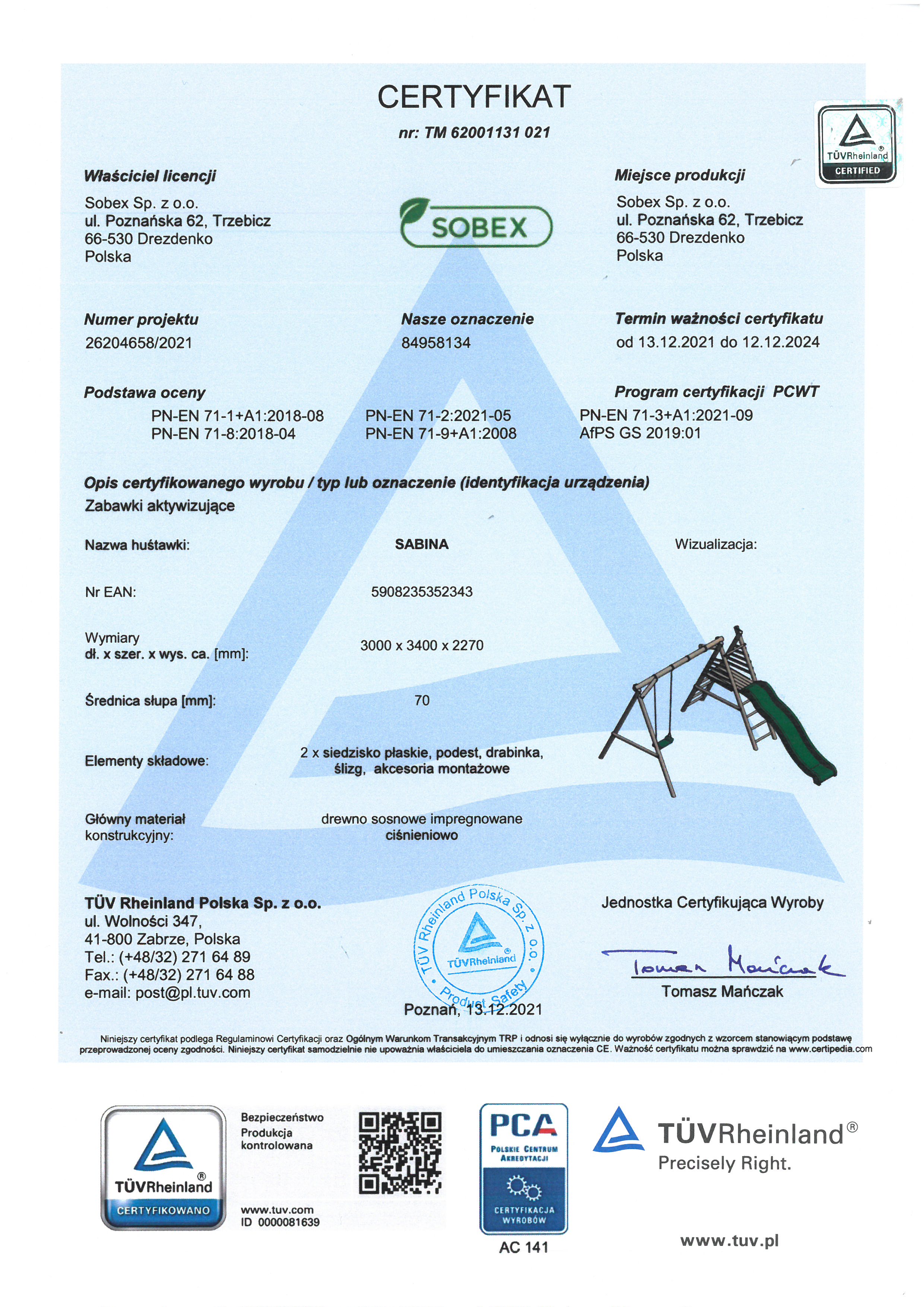 CERTYFIKAT TUV HUŚTAWKA SABINA