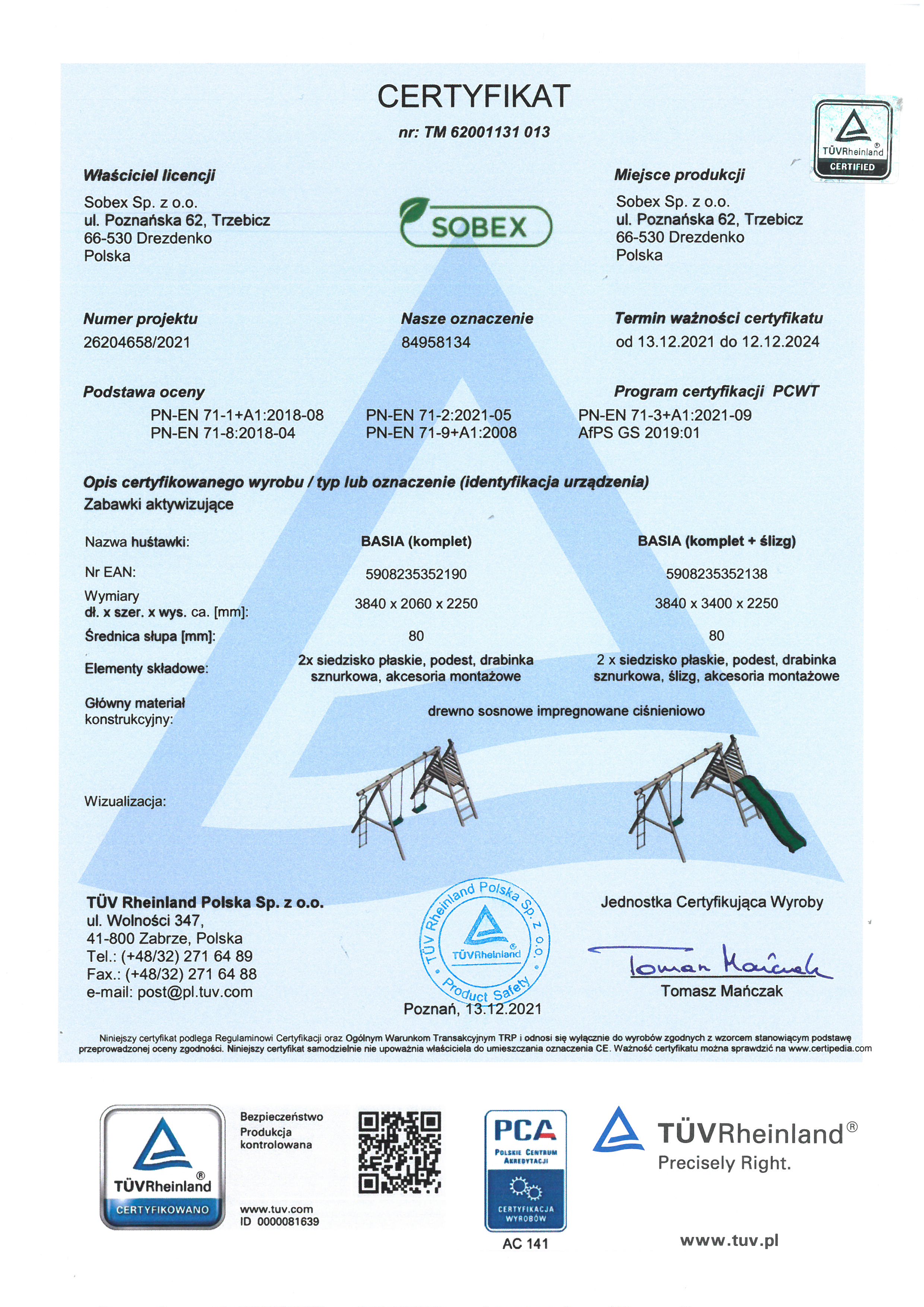 CERTYFIKAT TUV HUŚTAWKA BASIA